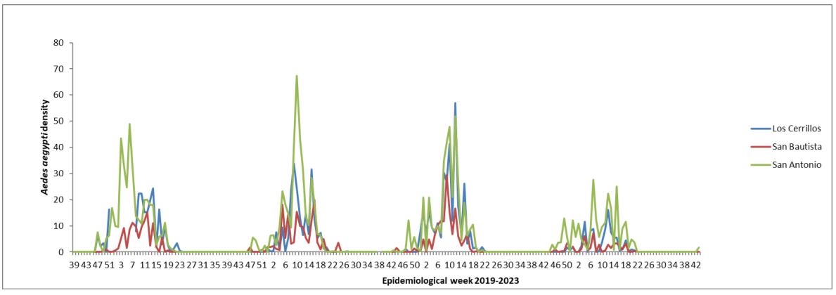 Figure 2 The average number of Aedes aegypti eggs per ovitrap in three cities of the Canelones department from 2019 to 2023.