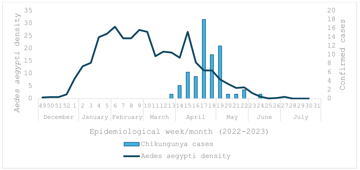 In 2023, the country experienced its first outbreak of Chikungunya in the city of Paysandú between March and May, involving 60 cases following a high vector density period (Figure 3).