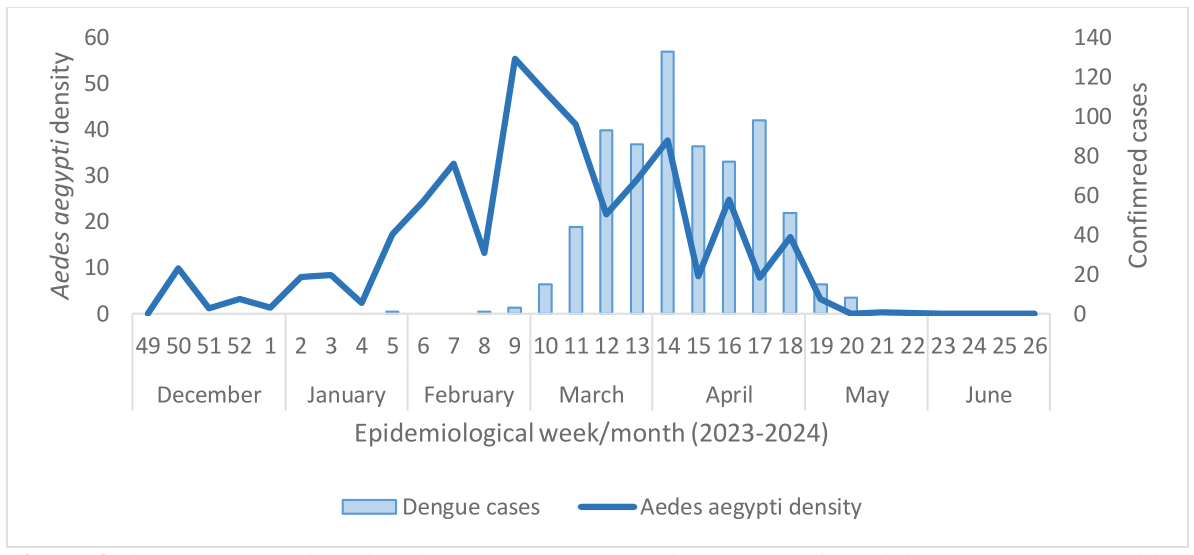 In 2024, Uruguay faced a significant dengue re-emergence, with 711 cases reported nationwide between January and May. Like previous ones, this outbreak peaked after periods of high vector density, coinciding with the end of summer and the beginning of autumn (Figure 4).