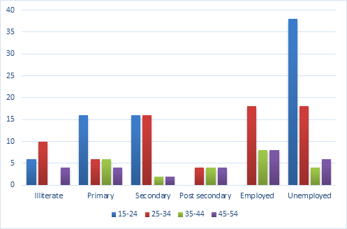 Chart 1 (Table 2) Showing the level of education and occupational distribution of the patients at JTH between Oct.2012 - Jan.2013.