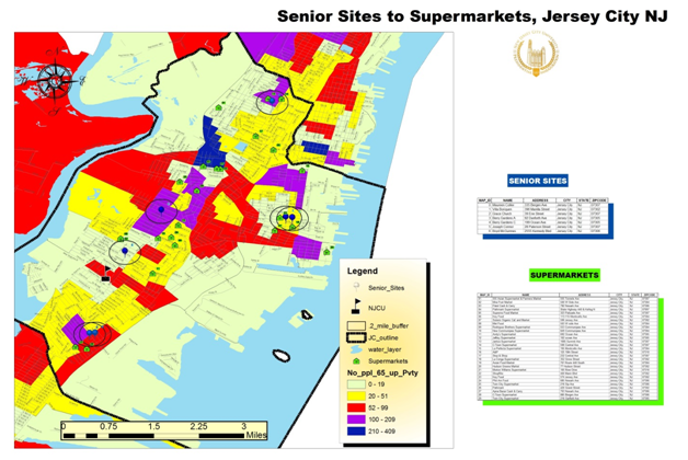 The GIS mapping was used as a tool to locate the distance and proximity of supermarkets to senior centers and discuss challenges to food accessibility, opportunities for travel, and community action needed to optimize nutritional options. A review of the literature shows how and when seniors are most likely to walk, drive, and use public transportation to enhance individual capacity. The focus groups at various senior sites will show that the built environment presents challenges by restricting walks in a high dense community, allowing seniors to access diverse food selection, shop during inclement weather, negotiating traffic lights and street crossings, and drive in traffic dense communities and use public transportation. The GIS mapping allows the service grant to access the distance of the senior centers to supermarket and advocate for various modes of transportation such as using senior housing vans, and simulating stress-free walks to nearby supermarkets in Jersey City (Figure 1).