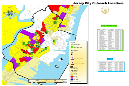 Jersey City’s Department of Health and Human Services (JCDHHS) and undergraduate community health students from New Jersey City University implemented “Cooking Matters”, a program designed to provide educational grocery store tours to low-income residents to increase access to healthy foods. The students employed GIS mapping to identify correlations between residents’ levels of economic prosperity and local food distribution businesses. The maps were displayed at community health events for educational purposes. What was found was that the GIS maps assisted with communicating to both targeted residents and policy makers quickly and comprehensively to ultimately motivating advocacy in both parties. Due to the maps’ ability to transcend multiple barriers such as language and literacy, they have the capacity to deliver effective services consistently while easily explaining diverse and ever changing complexities. One map can serve as multiple methods as an educational tool to showcase crucial patterns for community engagement and policy development (Figures 1-3).