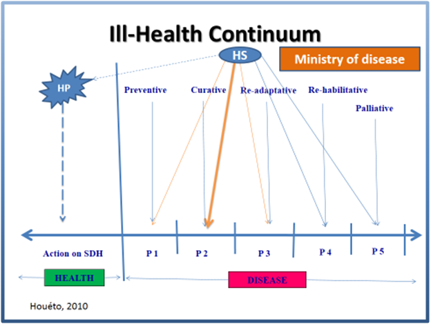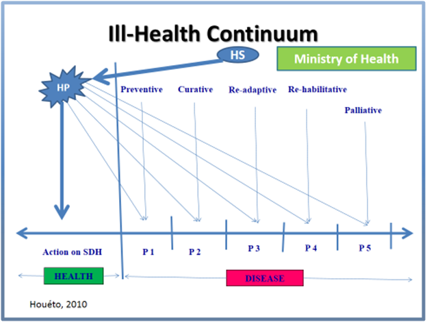 Discussions above clearly show that most of the health systems’ actions in Africa are disease-oriented, with no efforts aiming at their root causes. As shown in the "ill-health continuum" in Figure 1 below, when almost the entire expenditure and health action are channeled toward preventive, curative, re-adaptive and rehabilitative care, the current system is a disease-oriented. By extension, let’s understand that we are dealing with ministries of disease and not ministries of health. In such a condition, it is not possible to overcome successfully any disease; it persists according to the WHO Commission on SDH.9 Through the example of malaria, authors4,12 have shown that the approaches used so far in sub-Saharan Africa were inadequate and couldn’t curb the disease prevalence sustainably. The dominant vision of health in this kind of orientation is biomedical3 and there’s need to go beyond by integrating health and non-health sectors resulting from a bio-psychosocial vision of health which would provide an opportunity for the health sector to take great advantage of the action on the SDH in these other non-health sectors (Figure 1).11
