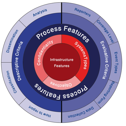 Through risk assessment, we can understand factors contributing to an adverse event (AE), all potential AE and types, obstetrics and defensive barriers and potential prevention strategies like Training and supervision, guidelines and pathways, human factors engineering in medical device and medical system errors and finally creating and maintaining safe systems of medical care.6 But complexity of health care industry requires risk managers to have a multifaceted vision. This means risk assessment should be done respect to all dimension and details both in retrospectives models like reporting systems or root cause analysis and prospective models like FMEA. These important dimensions have shown in Figure 1. Although emphasis of this figure is on reporting systems, but we recommend that all risk assessment tools require to follow such this comprehensive framework to identify and analyzing risk.3,7 Depends on systems which you plan to assessing risk, complexity of risk management would be varied. Information infrastructure is the main criteria to choose complicity level of analyzing.