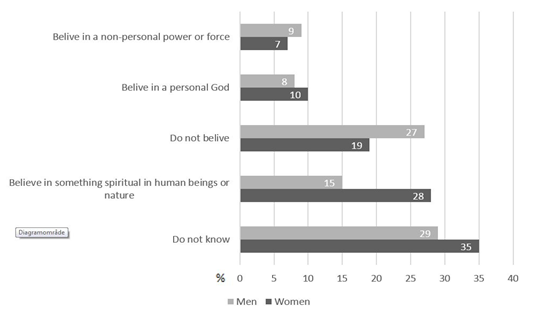 Having a spiritual belief (belief in a personal God, a non-personal power/force, or something spiritual in human beings/nature) was reported by 45% of the 499 women (n=224) and 32% (n=119) of the 371 men (Figure 1). Nineteen percent (n=93) of women and 27% (n=101) of men were not spiritual, and 35% (n=175) of women and 29% (n=106) of men did not know what to believe.