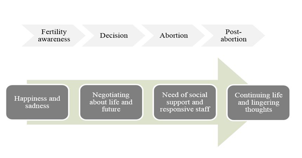 Results: Overall, the results revealed a great variation in spiritual and attitudes in relation to an induced abortion procedure, among both women and men. Spiritual beliefs were more common among women (45%) than among men (32%). Half of the women (50%) and a third of the men (33%) considered what had existed in the womb as being a child. A higher proportion of women (46%), than men (21%), thought about guilt and morals. After the abortion, about half of the women (54%) and 42% of men felt everything related to the pregnancy was over, and some thought about the child they could have had (50% women and 32% men). Induced abortion is a clinical procedure lined with existential aspects, characterized by four phases; “Fertility awareness – happiness and sadness”, “Decision–negotiating about life and future”, “Abortion – social support and responsive staff”, and “Post- abortion – continuing life and lingering thoughts”.