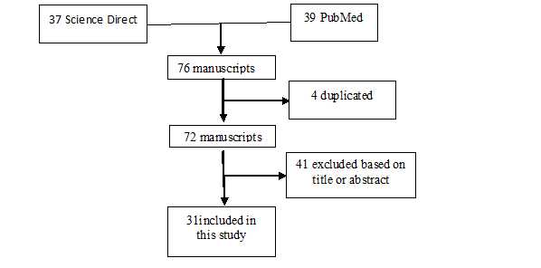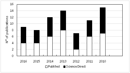 The article search through Science Direct and PubMed returned 37 and 39 results, respectively. The first graph shows the relation between year and number of publications, per database (Figure 1). Unfortunately, a big number of articles weren’t related directly to this study’s area, or were duplicated, or had other characteristic that made them unfit for this review, and were excluded, as shown in Figure 2 below.