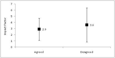The Figure 4 shows the relationship between the conclusion of each article and their impact factors. This does not include the “Sports Medicine Open” Journal, where “ACTN3 Polymorphism: Comparison between Elite Swimmers and Runners”5,6 was published, since it does not have a published impact factor. There was no significant difference (p=0.8588) between the impact factors of the journals that accepted or rejected the hypothesis of the influence of ACN3 R577X gene in the performance of high-performance athletes.
