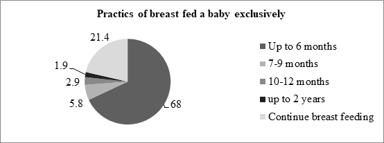 Results: It is really inspiring evidence that 99 percent mothers are currently feeding breast milk to their baby. About 38% of mothers have knowledge but only 26% did breastfeed to their children within one hour after delivery. Nearly 60% of mothers who have knowledge on giving complementary foods with breast milk after six months. But nearly 18% have different practice than ideally recommended. Very consistently, knowledge versus practice, only 34 percent mother have both knowledge and practice of complimentary foods three times in a day. The majority 67 percent respondents fed only breast milk whereas 33 percent were feeding fish/meat along with breast milk to the child during sick period.