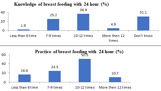 Study reveals that although the fewer knowledge, higher the practices on frequency of breast-feeding which is good among Chaudhary families. They fed breast milk to their children as much as possible in a day. During research it was found that about 37 percent mothers have good knowledge, but slightly more than half of the mothers have been practicing the correct frequency of breastfeeding within 24 hours.