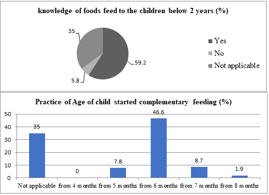 Mothers have knowledge but fewer did breastfeed to their children within one hour after delivery. Apparently, most of the mothers who have not knowledge but practiced early initiation of breast feeding. Knowledge on exclusive breastfeeding up to six months is universal though the practice lower of the infants under age six months were found exclusively breastfed. Majority of mothers who have knowledge on giving complementary foods with breast milk after six months. Complementary feeding has found inadequate, and mothers didn’t have adequate knowledge on child feeding. But some have different practice than ideally recommended. Less than half children are receiving rice, roti, cereals in their meal. Very consistently, knowledge and practice among mothers found regarding complimentary foods three times in a day. Though they know that higher frequency of complementary foods can help to child’s growth and development and healthy, the frequency is not enough for the children in the study area. The majority respondents fed only breast milk whereas feeding fish/meat along with breast milk found lesser during sick period. Consciously, some respondents had reported to avoid junk food during sickness.