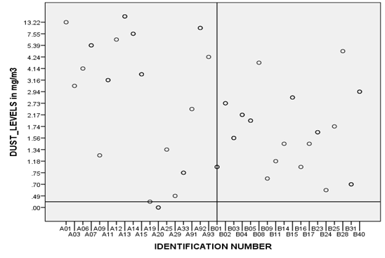 Multiple sources of fugitive dust emission were noted. In Factory A where ashes from the emission pipes which was sometime drawn by air to the working area, coal crushing was done inside Factory A. The total dust levels for Factory A was 3.18mg/m3 this is significantly higher as compared to Factory B 1.56mg/m3; these results are in line with the study done by WHO.22 All these activities were conducted within the Factory At Factory A, whereby they would be arranged to be performed at different locations. Maintenance activities involving welding of furnace parts and construction of furnace lining, which is conducted next to supervisors’ offices and lead ingot store, expose other workers unnecessary to noise and welding fumes while they are exposed to lead though their work could be accomplished without being exposed to lead.
