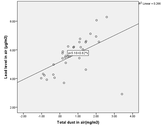 There is a significant association between the levels of total dust and lead in air where; p=0.002, Pearson Correlation coefficient (r= 0.516) and 26.6% of the variation of lead in dust is attributed by variation in total dust levels (Figure 3).