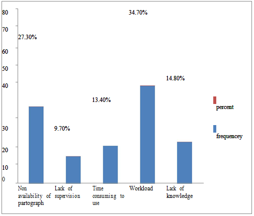 This study finding on level of utilization of Partograph is less than from that of Zambia (87.5%) and Eastern zone of Tigray (83%) (10,19). The difference between these studies may emanate from difference in sample size and time variation between the studies; since obstetric training and supportive supervisions increased through time which in turn promote knowledge of obstetric care providers to actively utilize Partograph. In the other side this difference may arise from variation in knowledge level of the study participants and also from their profession since in our study majority( 76.4%) of the respondents had good level of knowledge and greater than half (56.9%) of the respondents were Midwives: indicating the chance for utilization of Partograph.