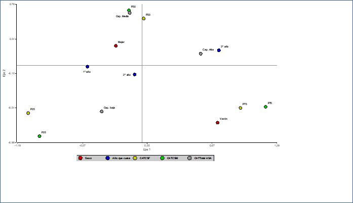 Based on the factorial analysis of gender, current academic year at university, category of responses in ASA and percentile of responses in HRQL variables, we can observe association levels between the first and second years completed with the lowest HRQL scores (Percentile 25(P25)) and the lowest response in ASA (Low Capability). In the upper left, the percentile 50 (P50) responses from the HRQL are associated with the ASA Medium capacity and the female students. On the other hand, male students are grouped into HRQL higher scores (P75), concerning physical and mental health as well (lower right).
