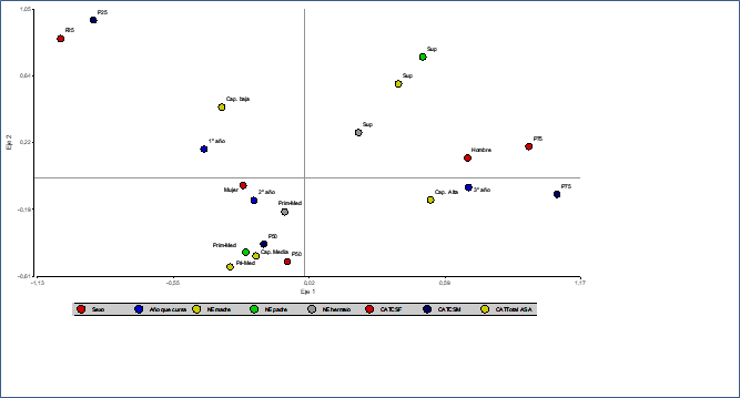 The same analysis logic was implemented, by gathering the previous variables, the father, mother and siblings’ educational backgrounds. Thus, in the lower left, it can be observed that the Primary and Secondary level of education of the father, mother and siblings is associated to the female students with medium category responses in ASA and mean values in HRQL (Figure 1,Figure 2).