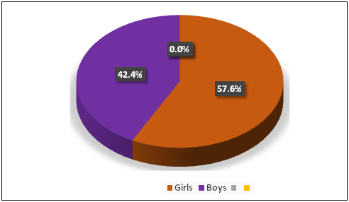 In this study, maximum (64.9%) of children were in the age group 25 to 59 months with a mean of 31.1 ± 16.2 months (Table 1). Out of 205 children total 118 (57.6%) were girls and 87 (42.4%) were boys (Figure 1). Among the total 205 mothers, more than half (56.59%) were in the age group between 18-25 years. The mean age of the mothers was 26.2 ± 4.9 years. The minimum age was 18 years and maximum was 38 years (Table 2). Regarding mother’s educational background, maximum (40.5%) were secondary educational level followed by primary (33.2%) and illiterate (19.5%) (Table 3). The average monthly family income was 14544.4 ± 1086.5 taka and more than one third (36.1%) of the respondent’s monthly family income between 6000-10000 taka, 23.90% respondent’s income between 11000-15000 taka (Table 4).Among 205 children, maximum (66.5%) children were normal in height for age, followed by 21.2% were moderately stunted and 12.3% were severely stunted (Table 5). Out of total 205 children, maximum (70.8%) of the children’s weight was within normal limit for their age followed by 16.1% children were mild underweight, 9.3% children were moderate underweight and 3.8% children severely underweight (Table 6). Among the total 205 children, maximum (87.3%) children were normal in height for weight category followed by 9.7% children were moderately wasted (MAM), 1.5% were overweight and only 1.5% children were severely wasted (SAM) in height for weight category (Table 7). Among the total 205 children, 19 children’s age was below 6 months therefore excluded from MUAC measurement. Hence 186 children were included for MUAC measurement. Out of 186 children, maximum (79.0%) children were normally nourished in MUAC measurement followed by 19.9% children were moderate acute malnutrition (MAM) and only 1.1% were severe acute malnutrition (SAM) in MUAC measurement (Table 8). Among the 205 children, most prevalent disease (45.0%) was diarrhoeal disease followed by respiratory tract infection was (32.0%), pneumonia (18.0%), febrile disease (6.0%), tonsillitis (5.0%), scabies (2%), otitis media (1.3%), and protein energy malnutrition was (0.9%) (Table 9).