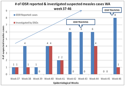 Following graph shows the # of suspected measles cases that were reported through IDSR system along with those that were investigated by the DSOs (Figure 1).