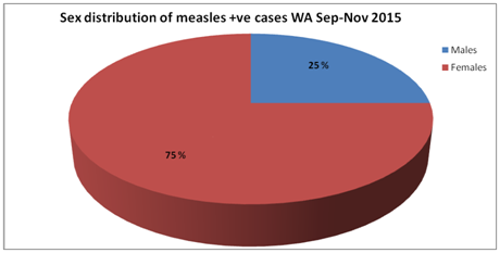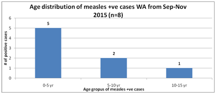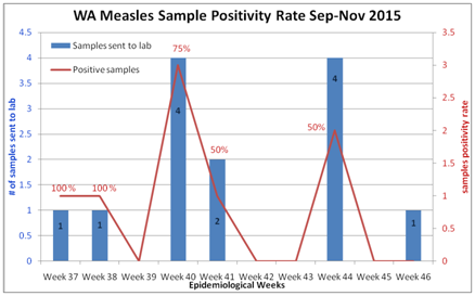 After the implementation of IDSR in Western Area the DHMT was systematically collecting, analyzing and interpreting the surveillance information received from 116 PHUs. There was a considerable rise in suspected measles cases seen over the last 11 weeks (36-46). The samples were collected and sent to lab for laboratory confirmation. During the EVD outbreak the reference lab for western area (CPHRL LAKKA) was not testing the measles samples due to some technical reasons like deficiency of lab reagents etc. There was a huge backlog of samples that was accumulated at DPC and it was just recent (19 November 2015) that the results were out from lab to all districts including western area. Western Area received results of samples that were sent to lab from September till November. There were a total of 14 samples of suspected measles cases sent to lab from 10 September till 19 November 2015. Out of these 14 samples results for 11 samples was out and out of those 11 results 08 were IgM positive for measles antibodies giving a sample positivity rate of 72%. The result of 03 samples is still pending.