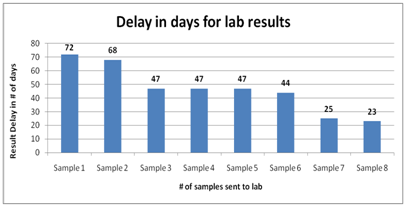 There was considerable delay in lab results after the initial submission of samples. Maximum delay was of 72 days while minimum delay was of 23 days.
