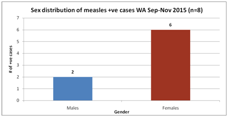 It is evident that females are affected more than the males. 06 (75%) out of 08 positive cases are females while 02 (25%) are males. The prevalence of measles is more in females as compared to males. Further analytical studies are required to explore the cause.