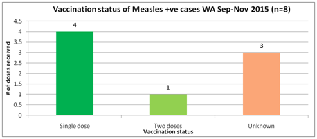 The analysis showed that 04 (50%) of the 08 positive cases had received single dose of MCV, 01 (12.5%) had received two doses while the vaccination status of 03 (37.5%) positive cases was unknown. The unknown vaccination status was due to unavailability of vaccination cards and parents difficulty in recalling about the MCV vaccine. For the case who received two doses of MCV can be due to receiving additional dose during SIAs.