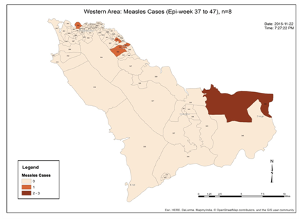 Following spot map shows the wards from where the measles cases were reported (Figure 8): Following table summarizes the locations from where the cases were reported: (Table 2). Following table shows the attack rates among various age groups: (Table 3).