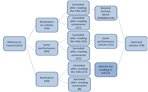 A total of 165 articles were identified in the period from 2000 to 2017. For the study, 78 articles were considered considering the criteria established in the methodology. We found 61 articles in Pubmed and 17 in Scielo. The articles selected come from countries where the situation of a post-antibiotic era approached more quickly, such as China and India, however, in this work articles were also used in which other countries such as the United States, Colombia, Brazil and Argentina reported incidences of the MCR-1 gene in Escherichia coli. And on the performance of the resistance gene, several studies that elucidate this mechanism in animals and foods were also used.