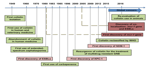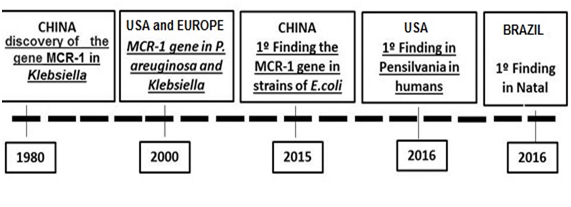 The emergence of MCR-1 heralds the violation of the last group of antibiotics, the polymyxins, by plasmid resistance. Currently, although more prevalent in China, MCR-1 is likely to match other global resistance. Mechanisms such as Metallo-Beta-Lactamase-1 (NDM-1), the findings of this study emphasize the urgent need for coordinated global action in the fight against pan-resistant Gram-negative bacteria. A retrospective study by Mohamed Rhouma et al.13 reported the identification of MCR-1 in strains of E. coli isolated in the 1980s, which seems to correspond to the first identification of ESBL enzymes. The first New Delhi Discovery (NDM-1) in 2009 was associated with a significant increase in the prevalence of the MCR-1 gene in strains of E. coli obtained from food and animal production. It has been observed that there is a historical link between MCR-1 and carbapenemase since 1980, it is believed that the re-evaluation of the use of colistin in animals needs an approach that includes not only the reduction of the use of colistin, but also the reduction of all use of antibiotics, to elucidate better, this fact is found in the following timeline (Figure 5).13
