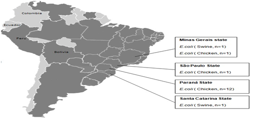 The presence of E. coli with plasmid-mediated MCR-1 in Brazil is also relevant for the country's medical centers, where the emergence and spread of multiresistant pathogens, associated with high rates of treatment failure and use of colistin, intensive care units.11 The fact that the MCR-1 gene occurs in brazilian cattle is a matter of concern in terms of Brazil's overall contribution to the national and international movement of people and products, as this could contribute to accelerating the worldwide spread of the MCR-1. In fact, with a population of 205 million inhabitants, Brazil has continental proportions and is the largest country in Latin America. In addition, in agribusiness, it is the third producer of chicken meat (only after the United States and China) and the largest exporter of this product.2 An aggravating factor is that colistin sulfate is widely used in animal feed as a growth promoter in brazilian cattle, especially in swine and birds, supporting a link between the agricultural use of colistin and its resistance.