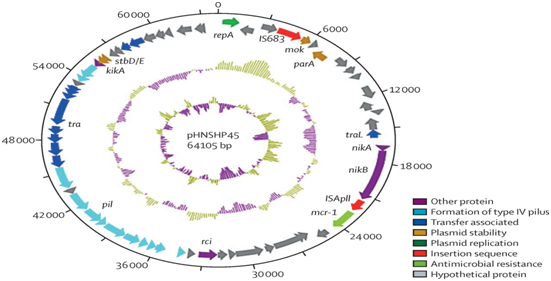 The resistance to colistin was related to chromosomal mutations and had never been reported to occur through horizontal gene transfer. During a routine surveillance project on antimicrobial resistance in commensal Escherichia coli from animals intended for consumption in China, a significant increase in resistance to colistin was observed. When a strain of E.coli, SHP45, resistant to colistin, which could have been transferred to another strain, was isolated from a pig, a more detailed analysis of the possible resistance to colistin mediated by plasmids was performed.5 Colistin resistance was found to be due only to the plasmid-mediated MCR-1 gene. The plasmid bearing MCR-1 was mobilized to an E. coli receptor at a frequency of 10-1 to 10-3 cells per receptor cell by conjugation and maintained in K. pneumoniae and Pseudomonas aeruginosa. In an in vivo model, the production of MCR-1 invalidated the efficacy of colistin. The MCR-1 gene is a member of the phosphoethanolaminatransferase enzyme family, being expressed in E. coli, resulting in the addition of phosphoethanolamine to lipid A, causing changes in the SHP45 plasmid (Figure 4).12