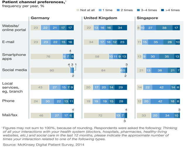 Even though digital storytelling has improved community outreach, there are certain challenges to it like, unclear boundaries, consent, and recruitment to participate, the power of shaping and harm, confidentiality issues as well as the release of material.8 The purpose of this paper is to review effective storytelling communication strategy for recent time. It discusses what the current technology tools are used in public health as a source of storytelling communication strategy. The Figure 1 is the survey held by McKinney in 2014. It describes various channels through which interaction occurs between health service provider and patient in Germany, United Kingdom as well as Singapore. The survey helps to estimate the percent frequency per year for several communication channel sources. It was clear that emails and online portals topped the preference over fax and mails, which indicates the frequency of more than four times per year. The figure reflects that patients are turning towards the use of modern technology to conventional methods of communication. Moreover, we need to keep in mind that the survey data is not age adjusted. Hence conclusions cannot be generalized regarding ease of preference use like emails, online portals and so on.