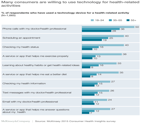 The Figure 2 explains about willingness by consumers to use technology for their health-related activities. The most preferred ones were phone calls followed by checking health information, e-mails, scheduling an appointment, etc. Since the data is not age adjusted, future surveys might want to address the age factor, which can help us optimize the insights for real world data.