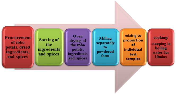 All the ingredients above were mixed in different proportions with the separately milled zobo petal powder.