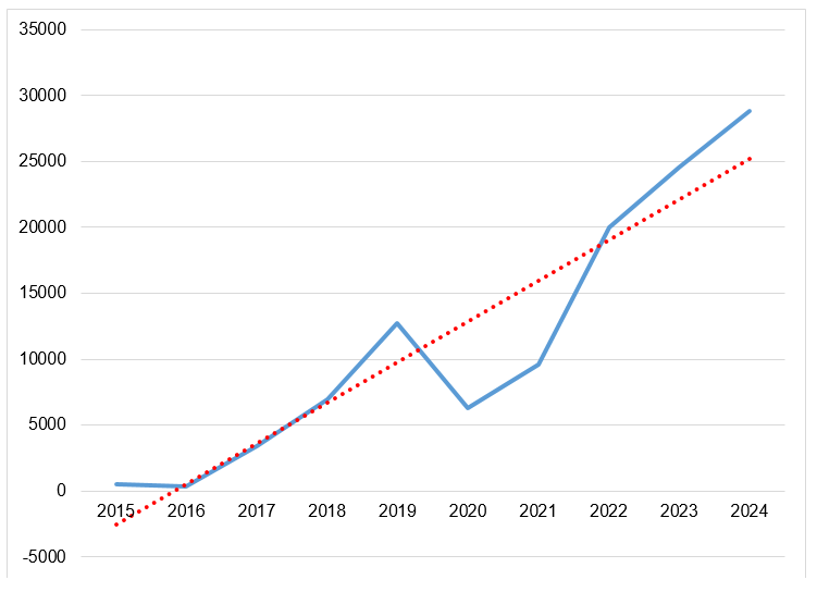 Palliative care services in primary care totaled n=113076, showing an increasing trend throughout the period, demonstrating a large increase from 2020 (n=6265 services), with significant peaks in 2019 (n=12757) and 2022 (19956), 2023 (24519) and 2024 (n=28827), and a decreasing peak in 2016 (n=374) and 2020 (6265). The year 2015, which begins the study period, had n=475 services. These data are represented by an average =11,307.6 (±10031.30) and Coefficient of Variation (CV) = 88.71% (Graph 1).