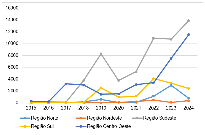 Graph 2 Distribution of palliative care services in Brazil, by region, from 2015 to 2024.