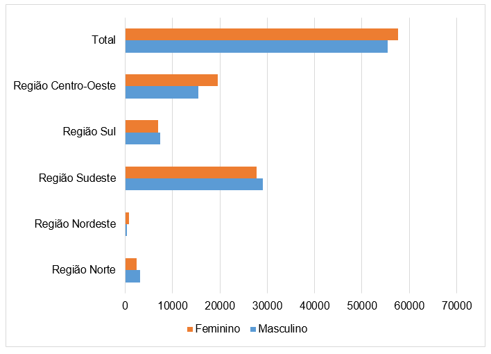 A regards the distribution of palliative care services by sex (Graph 4), females prevailed, with a total of n=57598 in Brazil, compared to the total of n=55478 cases of males in the national territory during the period analyzed. In the Central-West region, there was a greater number of cases in the female population (n=19632), while males (n=15389) represented a smaller number of cases. In the Northeast region, more frequent cases were observed in women (n=867), while men (n=403) had fewer cases. In the Southeast region, there was a greater number of cases in males (n=29015), a slight contrast to the females (n=27762). In the South region, more cases were also observed in men (n=7485), compared to women (n=6916). In the North region, there were also higher numbers of cases in the male population (n=3186), while the female population (n=2421) had lower numbers.