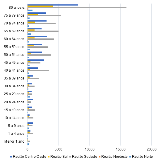 Regarding the age group for palliative care (Graph 5), the age group of 80 years and over had the vast majority of cases of chaos, totaling n=29320, throughout Brazil, during the years analyzed. Among individuals of this age, the region that represented the largest number of cases was the Southeast (n=15961), in second place the Central-West region (n=8150), followed by the South (n=4189), the North (n=840) and the Northeast (n=180). The age group with the second largest number of care is individuals from 75 to 79 years old, totaling n=10603, in which the Southeast region (n=5397) also led the number of cases, followed by the Central-West region (n=2962), in third place by the South (n=1772), the North (n=369) and the Northeast (n=103). The age group with the lowest number of cases was under 1 year old, with a total of n=967 palliative care visits, with the largest number in the Southeast (n=402), followed by the North (n=279), Midwest (n=148), South (n=128) and, lastly, the Northeast (n=11).