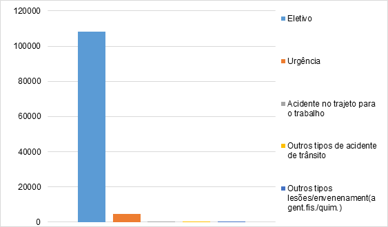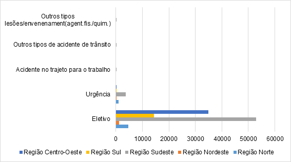 Regarding the type of care provided by region in palliative care (Graph 7), elective care, which predominated in the period studied, had the highest number of cases in the Southeast region (n=53007), followed by the Midwest (n=34944), in third place the South region (n=14400), then the North (n=4672) and lastly the Northeast (n=1263). Emergency care, classified as the type with the second highest number of cases, prevailed in the Southeast region (n=3,759), followed by the North (n=935), then the Midwest (n=77), Northeast (n=7) and lastly the South (n=1). About other types of traffic accidents, the Southeast represented n=6 computed cases. Regarding accidents on the way to work, the Southeast region concentrated n=4 in the period studied. Regarding the type of injury/poisoning (physical/chemical agents), the only type of care also occurred in the Southeast region (n=1).
