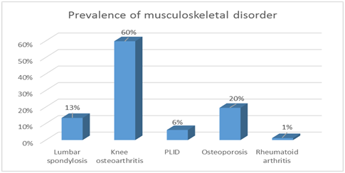 Geriatric people are an asset rather than burden if we properly take care because we have to step in that particular age group in certain period of life. Risk factors for falls include muscle weakness, a history of falls, use of four or more prescription medications, use of an assistive device, arthritis, depression, age older than 80years, and impairments in gait, balance, cognition, vision, and activities of daily living. The present study found high prevalence (95%) of musculoskeletal pain among elderly people though sample size was not too large. Lower back pain, knee pain, hip pain and neck pain were common. One third of the patients suffered from joint limitation. Knee joint limitation was common. Almost 84% of the respondents suffered from muscle weakness. Seventy eight percent of the respondents faced difficulties in activities in daily living and walking was common. The study by Krishna swamy and Shanthi has also indicated that musculoskeletal problems like osteoarthritis, rheumatoid arthritis, myopathy secondary to hypothyroidism, cervical and lumbar spondylosis were the cause for falls in elderly. Neurological illnesses, which cause deterioration of sensorimotor function of muscle, contribute to falls. Musculoskeletal disease, physical disability or limited activity increased the risk of fall by two to four times.6 Many societies in Western Europe and Japan have ageing populations. While the effects on society are complex, there is a concern about the impact on health care demand. The large number of suggestions in the literature for specific interventions to cope with the expected increase in demand for long-term care in ageing societies can be organized under four headings: improve system performance; redesign service delivery; support informal caregivers; and shift demographic parameters. The annual growth in national health spending is not mainly due to increasing demand from ageing populations, but rather has been driven by rising incomes, costly new medical technology, a shortage of health care workers and informational asymmetries between providers and patients. A number of health problems become more prevalent as people get older. These include physical health problems, especially musculoskeletal disorder.7 It has been estimated that population ageing only explains 0.2 percentage points of the annual growth rate in medical spending of 4.3 percent since 1970. In addition, certain reforms to Medicare decreased elderly spending on home health care by 12.5 percent per year between 1996 and 2000. This would suggest that the impact of ageing populations on health care costs is not inevitable.8 Musculoskeletal disorders remain prevalent in the elderly population. Given the increasing proportion of elderly population in the world population and the burden of MSK diseases among the elderly people, efforts must be made to maintain their functional capacity for as long as possible through optimal primary and secondary health care. A total of 85 articles were included with 173 different prevalence estimates. Musculoskeletal disorders are common in the elderly population, but due to heterogeneity of the studies, no general estimate on the prevalence of MSK can be determined. Women report more often MSK pain than men. Overall, prevalence estimates either remain fairly constant or increase slightly with increasing age, but with a tendency to decrease in the oldest (80+) people.9 From a health care perspective, the rising proportion and burden of older people demands that health care professionals increase their awareness of the health and disability of this particular population. Accordingly, there is a need to better understand the current magnitude and impact of MSK conditions from this growing population.