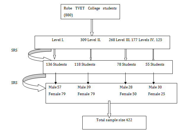 Robe TVET classes and respective numbers of students in the classes were identified and selected by using proportional allocation to sample size and simple random sampling technique was used to select study participants from each class (Figure 1).