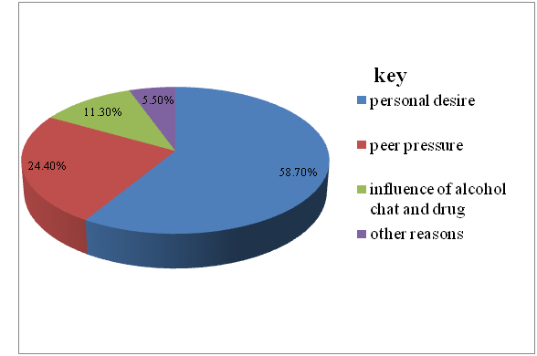 The prevalence of premarital sexual practice among study participant was 51.9% with mean age of 17.7years and maximum age 21 and minimum ages 14. When compared to study conducted at Nekemte, premarital sex was 21.4%19 and Agaro High school, 25%.20 The premarital sexual practice is higher when compared to these studies because participants of this study are affected by peer pressure and living separated from their parents where family fear and control is not available.19,21,22 Being adolescent and early adulthood is characterized by different types of risky behaviors, including risky sexual practice, substance abuse and exposure to STIs.23 Adolescents and college students premarital sex is increasing around the world many of which are risky, unplanned and unprotected.18,24,25 The mean age of first sexual intercourse of the study participants at which 17.7years which is higher than the study conducted at Addis Ababa was 12years for boys and 14years for girls.26 This is may be due to many of the study participants are from rural area living in the town for education. The main reason of having sexual intercourse of study subjects is personal desire, 118(58.7%) followed by peer pressure, 49(24.4), substance use, 23(11.4%). But the reason of having premarital sex among Addis Ababa high school students was peer pressure (35.2%) rape and use of drugs which is comparable to the current study (38). Out of study participants who experience premarital sex 90(44.8%) had only one sexual partners whereas 68(33.8%) had two sexual partners and the remaining, 43(21.4%) of them had more than two sexual partners. Similarly the study conducted among Agaro High school students showed that 55.6% had one sexual partner.19 Using condom during sexual intercourses is one of the preventive methods of STIs including HIV/AIDS and unwanted pregnancy. 52.7% of study participants were used condom during first sexual intercourse and 67.25 were used condom during their most recent sexual intercourse. When compared to the study conducted in different parts of Ethiopia, among secondary school students, in North West Ethiopia, 45.9% were used condom27 and among Agaro High school students, 54.4% were used condom during their sexual practice.19 The study subjects of this study area were highly utilized condom during their sexual practice the reason behind may be due to level of education and better access to reproductive health. Out of total respondents 26.8% drinking alcohol, 10.0% of them smoking cigarette and 35.1% were chewing chat. Study conducted to other part of Ethiopia, West Shoa, showed that, 16.7% of respondents reported to chewing chat and 66.7% of them were consuming alcohol. When we compare alcohol consumption, it is lower than in this study, this may because of low income and religion implications.28‒36 But smoking cigarette and chewing chat are comparable. Sex and respondent’s family’s monthly income were among socio demographic variables associated with premarital sexual practice. Male students are 2.638 at risk to experience premarital sexual practice compared to female students. But it was found to be less likely among students whom their family’s monthly income is >4500 ETB and 3501-4500 ETB compared to whom respondents monthly family income is <1500. This may be because of respondents whom family incomes is less is more likely to be involved in premarital sexual practice for economic problem than whom family’s monthly income is more. It was found that respondents who drink alcohol were 3.56(2.65, 4.77) at risk to practice premarital sex than who never drink alcohol, who chew the chat were 2.60(1.52, 4.45) at risk to practice premarital sex than who did not chew and who smoke cigarette were 6.45(3.33, 12.50) at risk to practice premarital sex.37‒46 When we compare with study conducted at West Shoa Zone, Oromia regional state, students who drink alcohol were 2.6times more likely to be involved in premarital sexual practice when compared to students who did not drink alcohol.