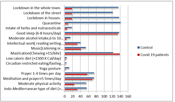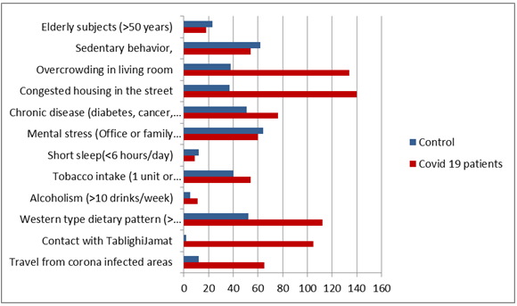 Results: The prevalence of risk factors, travel history in areas infected with COVID-19, contact with Jamat, tobacco consumption, Western-type diet were significantly (P< 0.05) more common among patients with COVID-19 compared to the control group. Congested housing and over-crowding in the house were also significantly (P<0.01) more common among patients compared with control subjects. There were a significantly(P<0.01) lower prevalence of physical activity, music listening, yoga practice, moderate alcohol intake, and intake of herbs and nutraceuticals among COVID-19 patients compared to the control group.