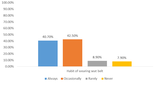 Moreover, in this study there is no observed statistical association between road traffic accident & educational status, wearing a seat belt, type of vehicle, driving under the influence of alcohol.