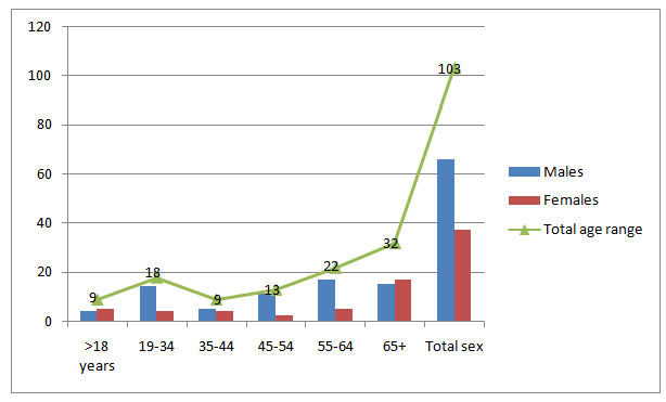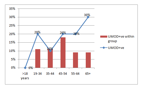 This study investigated 103 patients with renal failure, their age ranging from 6 to 99 with a mean age of 51 years. Of the 103 patients, 66/103 (64%) were males and 37/103 (36%) were females, giving males’ females’ ratio of 1.78:1.00, as indicated in Figure 1. As indicated in Figure 2. The distribution of UMOD gene mutations was relatively similar among different age groups within the range from 34 to 66+ years with increased percentage of among elder patients (age group 65+ constituting 30% of the total mutations). However, when comparing the percentages within each age range, age group 45-54, representing the highest (18%). Of the 10 patients with UMOD gene mutation, 6/10 (60%) were identified among males and the remaining 4/10(40%) were identified among females. The relative risk (RR) associated with female sex and the 95% confidence interval (CI) was 1.2252 (0.3690 to 4.0685). The association of rs12917707 with renal failure was insignificant and showed some heterogeneity across studied subjects (p-heterogeneity=0.02). In regard to the relationship between UMOD gene mutation and ethnic groups, the majority of cases with UMOD gene mutation were identified among Shammari families representing 70%, as indicated in Figure 3. Regarding the association of Nitrogenous Metabolites with UMOD gene mutations, all patients with UMOD gene mutation were found with high creatinine levels. High urea levels were identified among 70% of patients with UMOD gene mutation. On the other hand 60% of patients with UMOD gene mutation were found with low uric acid levels. Moreover, high blood glucose levels were identified among 70% of patients with UMOD gene mutation, as seen in Table 3.