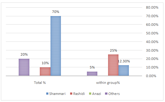 CKD is a life-long disorder associated with considerable morbidity and mortality due to complications from a progressive loss of kidney function and eventual renal failure. Early diagnosis and detection of the etiologic factors are important to improve the health outcomes of patients with CKD. Uromodulin-associated kidney disease is caused by UMOD gene mutations and leads to end-stage renal disease. However, the recent studies from KSA have reported high prevalence rates of different CKD stages with considerable increase in the CKD associated risk factors.6–11 Although, these studies have investigated many risk factors that has direct or indirect impact in the etiology of CKD that in most instances might develop to renal failure, they didn't investigate the influence of genetic mutation particularly UMOD gene mutations. To the best of our knowledge this is the first report from KSA in this context. Since, UMOD gene mutations are responsible for the autosomal dominant inheritance of chronic interstitial disease, prevalence rates variations are expected among different populations. Polymorphisms in the UMOD gene have been found responsible for increased urinary uromodulin production and an increased risk of CKD.17 Families with uromodulin-associated kidney diseases have been reported from the United States, France, the United Kingdom, Morocco, Turkey, and South Korea.18–23 Furthermore, multiple novel rare variants in the UMOD region were identified, but none were consistently associated with eGFR. Only V458L had modest association with THP levels in the general population and thus could not account for the observed genome-wide association studies (GWAS) signal.24 GWASs have identified multiple loci associated with cross-sectional eGFR, but a systematic genetic analysis of kidney function decline over time is missing. In a study performed a GWAS meta-analysis among 63,558 participants of European descent, initially from 16 cohorts with serial kidney function measurements within the CKDGen Consortium, followed by independent replication among additional participants from 13 cohorts. In stage 1 GWAS meta-analysis, single-nucleotide polymorphisms (SNPs) at MEOX2, GALNT11, IL1RAP, NPPA, HPCAL1, and CDH23 showed the strongest associations for at least one trait, in addition to the known UMOD locus, which showed genome-wide significance with an annual change in eGFR. In stage 2 meta-analysis, the significant association at UMOD was replicated. Associations at GALNT11 with Rapid Decline (annual eGFR decline of 3ml/min per 1.73m2 or more), and CDH23 with eGFR change among those with CKD showed significant suggestive evidence of replication. Combined stage 1 and 2 meta-analyses showed significance for UMOD, GALNT11, and CDH23. Morpholino knockdowns of galnt11 and cdh23 in zebrafish embryos each had signs of severe edema 72h after gentamicin treatment compared with controls, but no gross morphological renal abnormalities before gentamicin administration. Thus, our results suggest a role in the deterioration of kidney function for the loci GALNT11 and CDH23, and show that the UMOD locus is significantly associated with kidney function decline.25 In the present study 70% of patients with UMOD gene mutation were found among Shammari families. Notably, this ethic group represents around 55% of our studied subjects, see Figure 3.