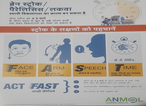 To celebrate World Stroke Day (WSD) 2023, a stroke awareness camp was organized by the department of neurosciences. Since WSD fell on Sunday Oct 29th, the camp was organized on Friday Oct 27th from 10 am to 2 pm. Our objective was to screen hospital employees for stroke risk factors and spread stroke awareness. Leading up to the camp, we requested the human resources (HR) head of the hospital to send an e-mail to all hospital employees informing them of the camp and encouraging their participation. We also reached out to Chairmen of different departments informing them of the camp and requesting them to encourage their staff to attend. Flyers were e-mailed to all hospital employees. A day before the camp (Oct 26th), flyers were manually inserted in between pages of the local newspaper to advertise the camp and the services provided. Four stations were set up in the patient waiting area outside the neurosciences department. The first station was the intake/triage station and was manned by the neurosciences registered nurse (RN). Every attendee registered at this station and vitals were then taken by the RN. These included pulse rate, blood pressure and respiratory rate, oxygen saturation by pulse oximetry, weight, and body mass index. At the second station, every attendee was guided by a staff member to use a Stroke Risk app by scanning the QR code with their hand-held smartphone. This easy-to-use app helped assess that individual’s stroke related risk by factoring in information such as age, gender, medical conditions such as essential hypertension, diabetes, dyslipidemia, health factors such as smoking, alcohol intake, diet, tobacco consumption and lifestyle such as daily exercise. At the third station, the data generated by the Stroke risk app was reviewed by a neurologist and the patient was counselled on stroke risk reduction. Each attendee was also educated on stroke identification and given flyers that listed F.A.S.T. warning signs. These flyers were available in both English and Hindi (Figure 1 & Figure 2). Attendees who had suffered a stroke were directed to the fourth station, where they could talk with a stroke rehabilitation specialists. At this station, the stroke patient and caregiver were educated on stroke rehabilitation physiotherapy. During the event, all the participants were provided a packed lunch.