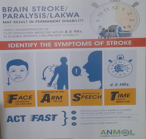 Stroke awareness spreads by word of mouth. Each attendee was encouraged to educate their family members and friends about stroke, stroke risk factors and stroke identification signs. We encouraged all the attendees to share the F.A.S.T flyers with friends and family members. There are severe initiatives which have been launched at national and international level by governments and organizations such as American Academy of Neurology and American Heart Association to improve public awareness of the symptoms of the stroke and to treat it as a medical emergency.5