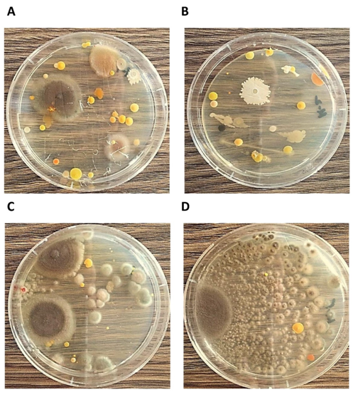 Figure 1 Representative microbial colonies from students’ laptop (A and B) and mobile phone (C and D) samples.