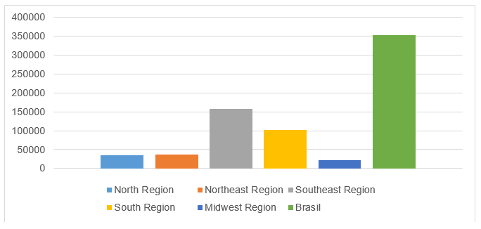 In respect of the confirmed cases of hepatitis distributed across Brazilian regions (Graph 2), the Southeast had the highest number of confirmed cases, with n=158044, representing 45% of the number of confirmed cases in Brazil. The second region with the highest number of confirmed cases was the South, with n=102208, representing 29% of cases in Brazil. As regards the Northeast and North regions, both obtained data that showed a share of 10% of cases, with n=37160 and n=34957, respectively. Regarding the Midwest region, it is the region with the lowest number of confirmed cases, representing 6% of these cases, with n=21325.